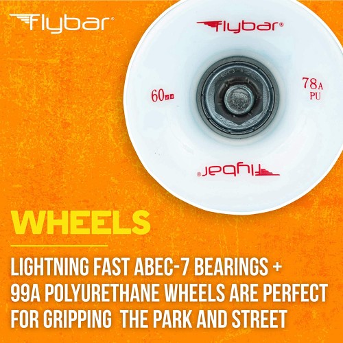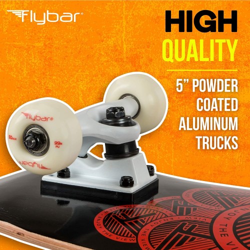 Τα skateboard της Flybar είναι εξοπλισμένα με ανθεκτικά trucks 5 ιντσών κατασκευασμένα από αλουμίνιο για την διατήρηση χαμηλού βάρους και διαθέτουν τροχούς 50 χιλιοστών τύπου PU 99A με ρουλεμάν ABEC7 που διασφαλίζουν την γοργή και ομαλή κύλιση του skateboard.