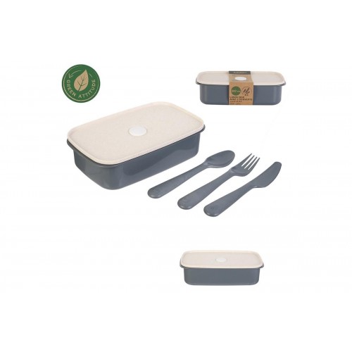 Περιεχόμενα: 1 Δοχείο φαγητού,1 κουτάλι, 1 μαχαίρι, 1 πιρούνι κατασκευασμένα από σιτάρι και Bpa Free υλικά