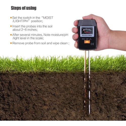 Μετρητής 3 σε 1 που παρέχει πληροφορίες για την υγρασία, την ένταση του φωτός και το pH του χώματος ώστε να έχετε άμεσα τις πληροφορίες που χρειάζεστε για μια σωστή και αποδοτική καλλιέργειΔιαθέτει διακόπτη μέσω του οποίου μπορείτε να επιλέξετε την μέτρηση που θα πραγματοποιηθεί και ευανάγνωστη οθόνη με ακριβείς ενδείξεις των μετρήσεων.