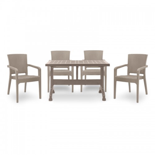 Το σετ τραπεζαρίας Callan αποτελεί ιδανική επιλογή για το μπαλκόνι, τον κήπο αλλά και για επαγγελματική χρήση. Το σετ περιλαμβάνει το τραπέζι Callan 120x70 κατασκευασμένο από ανθεκτικό πολυπροπυλένιο και τέσσερις καρέκλες Clio από ανακυκλώσιμο υλικό σε cappuccino απόχρωση.