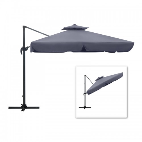 Τετράγωνη κρεμαστή ομπρέλα αλουμινίου με τηλεσκοπικό μηχανισμό και διπλό αεραγωγό που επιτρέπει την κυκλοφορία του αέρα μειώνοντας ταυτόχρονα την πίεση του. Ιδανική επιλογή για επαγγελματική χρήση όπως beach bars, πισίνες και χώρους εστίασης.