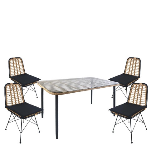 Σετ Τραπεζαρία Κήπου ArteLibre AMPIUS Φυσικό-Μαύρο Μέταλλο-Rattan-Γυαλί Με 4 Καρέκλες 14990299