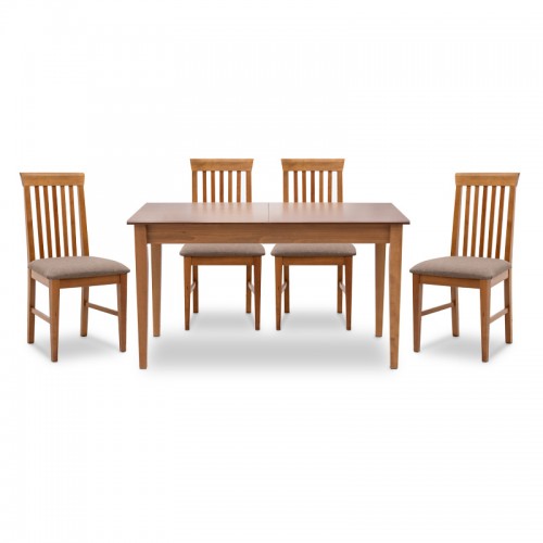 Για εσάς που ψάχνετε μια τραπεζαρία σε κλασσική γραμμή, η τραπεζαρία Adare σε χρώμα καρυδί είναι η ιδανική επιλογή και θα ταιριάξει σε κάθε σπίτι. Ο σκελετός του τραπεζιού και των καρεκλών είναι κατασκευασμένος από μασίφ ξύλο οξιάς που τον καθιστά στιβαρό και υψηλών αντοχών στο χρόνο. Η επιφάνεια του τραπεζιού είναι κατασκευασμένη από MDF εξαιρετικής ποιότητας. Η τραπεζαρία αποτελείται από ένα επεκτεινόμενο τραπέζι και τέσσερις καρέκλες.