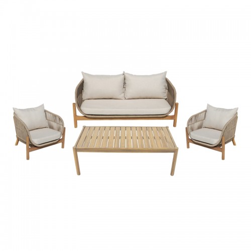 - Η επένδυση των δύο πολυθρόνων και του 2θέσιου καναπέ είναι ύφασμα 230 gsm υψηλής ποιότητας σε μπεζ χρώμα, με ειδική επεξεργασία για να είναι ανθεκτικό στις ακτίνες του ήλιου και στην υγρασία, ενώ λειτουργεί απωθητικά προς το νερό. Δεν προορίζεται για παρατεταμένη έκθεση σε δυνατή βροχή ή στάσιμο νερό.