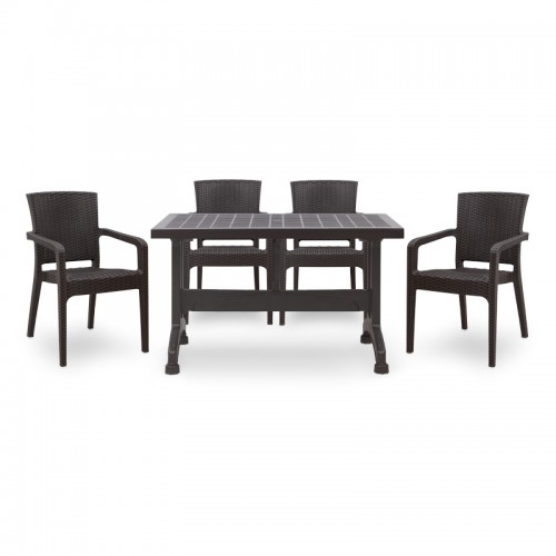 Το σετ τραπεζαρίας Callan αποτελεί ιδανική επιλογή για το μπαλκόνι, τον κήπο αλλά και για επαγγελματική χρήση. Το σετ περιλαμβάνει το τραπέζι Callan 140x80 κατασκευασμένο από ανθεκτικό πολυπροπυλένιο και τέσσερις καρέκλες Clio από ανακυκλώσιμο υλικό σε καφέ απόχρωση.