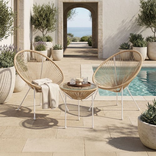 - Μοντέρνο Design: Ο σκελετός από ανθεκτικό μέταλλο σε λευκό χρώμα και το κομψό, pe rattan σε φυσική απόχρωση δίνουν μια minimal και σύγχρονη αισθητική που ταιριάζει παντού. (Το PE rattan είναι ένα είδος οικολογικού συνθετικού rattan, ανακυκλώσιμο και με μεγαλύτερη ανθεκτικότητα σε σχέση με τα άλλα είδη.)